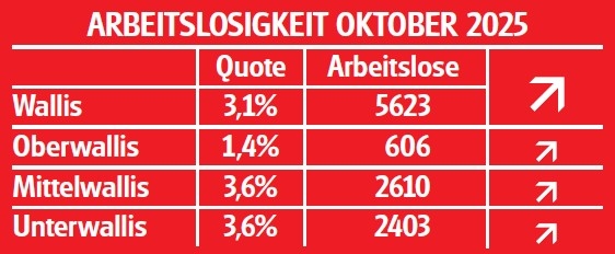 Ende Oktober waren in den Regionalen Arbeitsvermittlungszentren (RAV) des Wallis 5’623 Arbeitslose gemeldet. Im Vergleich zum Vormonat sind dies 345 mehr. Die Arbeitslosenquote stieg um 0,2 Prozentpunkte auf 3,1 Prozent.