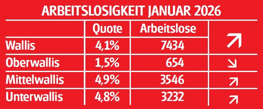 Ende Januar waren in den Regionalen Arbeitsvermittlungszentren (RAV) des Wallis 7434 Arbeitslose gemeldet. Im Vergleich zum Vormonat sind dies 216 mehr. Im Kanton Wallis stieg die Arbeitslosenquote leicht um 0,2 Prozentpunkte auf 4,1 Prozent an.