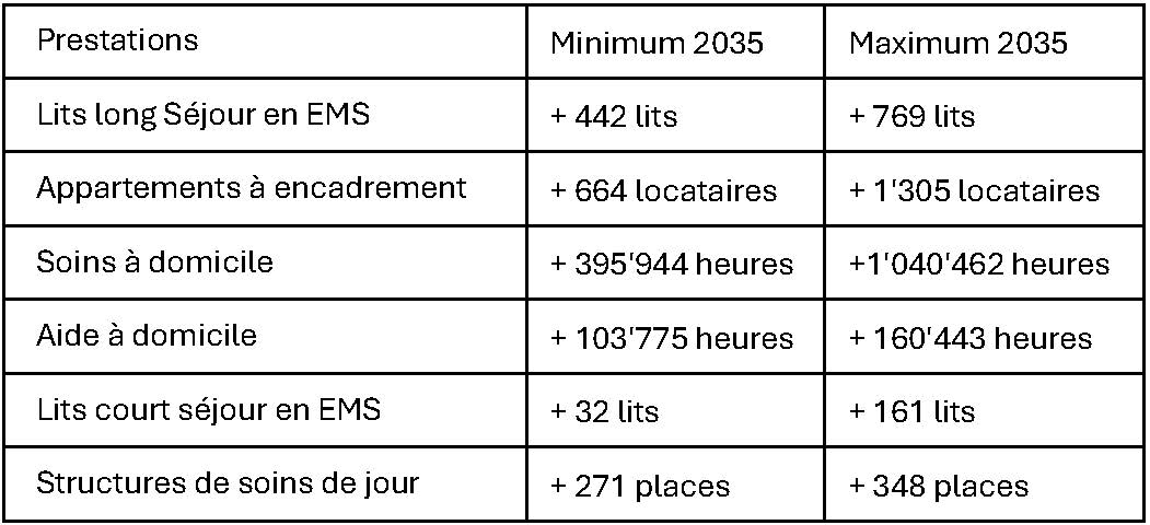 En conséquence directe de cette évolution, le rapport provisoire de planification des soins de longue durée prévoit entre 442 et 769 lits de long séjour en EMS supplémentaires sur la période 2026-2035. Investir dans ces structures permettra non seulement de répondre aux besoins, mais aura également du sens du point de vue des finances puisque la prise en charge en EMS est moins coûteuse qu’à domicile pour les situations présentant un besoin en soins de niveau moyen à élevé. Le nombre de lits d’EMS augmenterait cependant moins rapidement que celui des personnes âgées. Une telle évolution ne sera soutenable que si l’offre en appartements à encadrement médico-social, intégrée pour la première fois dans cette planification, augmente de manière à pouvoir y héberger entre 664 et 1’305 personnes supplémentaires. Les appartements à encadrement médico-social permettent de fournir plus efficacement les soins en réduisant les frais de déplacement du personnel soignant pour les personnes ayant un besoin faible en soin.